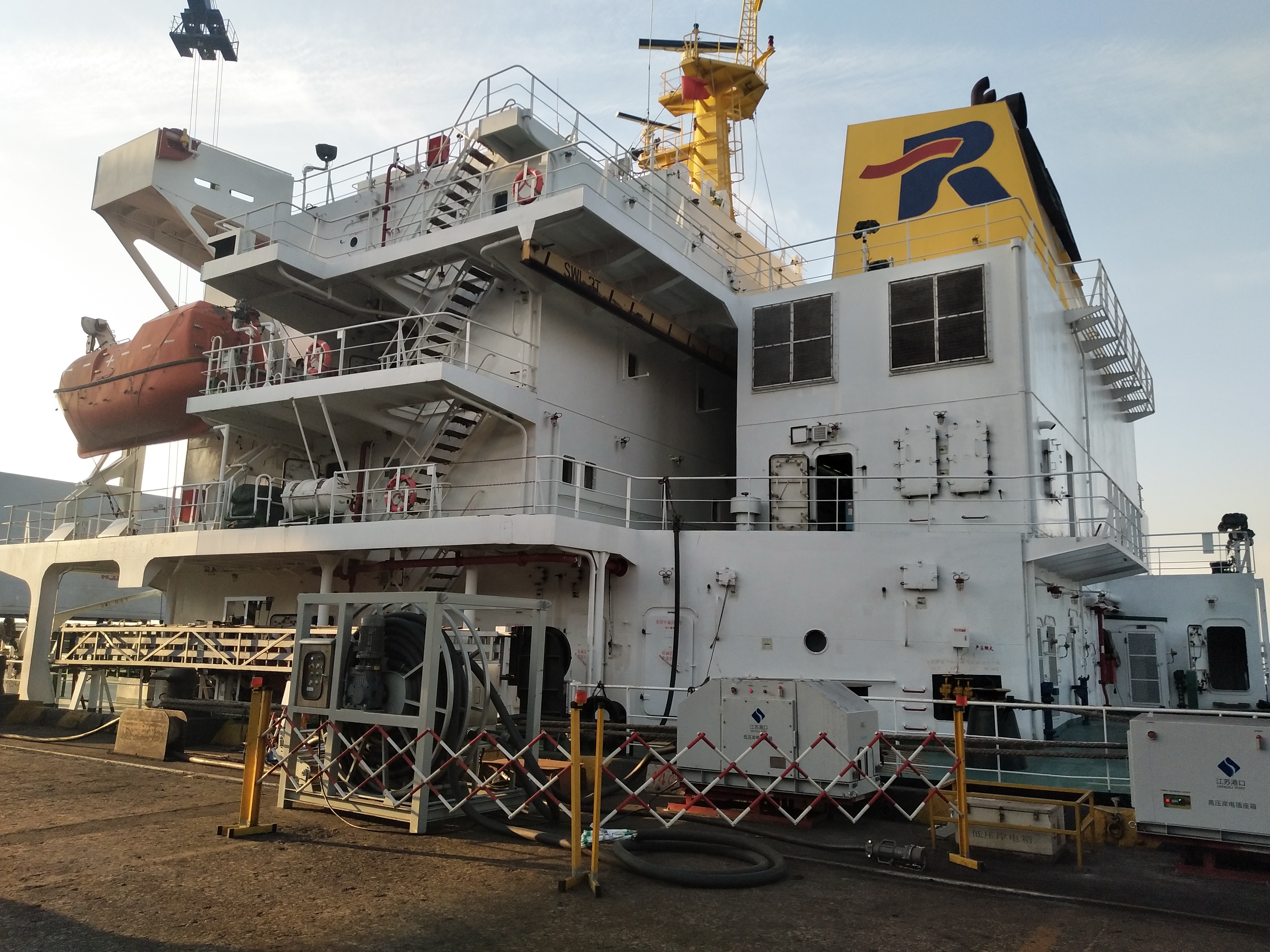 “長春門”輪船載重51000噸,船舶發電機560kW,需在南京新生圩碼頭靠泊作業40小時。據測算,船舶岸電系統與“長春門”輪于117日上午824分成功解列后,該輪靠港期間共使用岸電42小時,消耗電能7000千瓦時,可替代柴油2.5噸,減排二氧化碳近0.5噸。由此可見,岸電系統的使用不僅減少了燃料的消耗,且大大降低了靠港期間的污染物排放量。